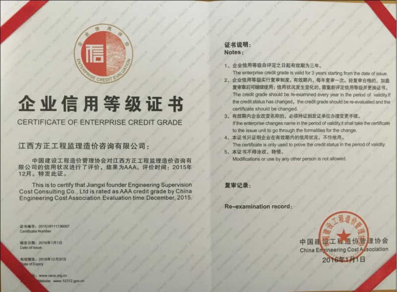 江西方正工程監(jiān)理造價咨詢有限公司于二OO三年五月在南昌市工商行政管理局注冊(注冊號:360100210024211),成立的有限責(zé)任公司,先后取得建設(shè)部及江西省建設(shè)廳頒發(fā)的建設(shè)施工工程造價咨詢企業(yè)資質(zhì)、招投標(biāo)代理機(jī)構(gòu)資質(zhì)、工程監(jiān)理資質(zhì)及江西省財政廳頒發(fā)的采購代理資質(zhì),是專門從事工業(yè)與民用建筑工程造價咨詢、工程建設(shè)招投標(biāo)代理、工程監(jiān)理及采購代理的公司。